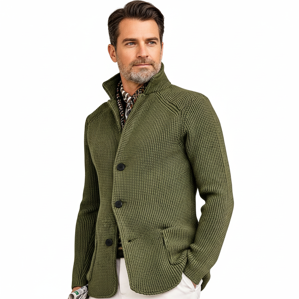 このニットカーディガンで、快適さとスタイルの究極の組み合わせを体感してください。リブ編みの構造とハイネックが洗練された印象を与え、あらゆる場面にぴったりです。